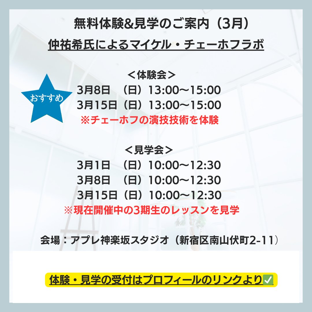| ■仲メソッド Instagram:https://www.instagram.com/chekhov_method/ ■公式note:https://note.com/chekhov_method ■チェーホフラボ4月期のご案内:https://apres.jp/news/795/ |